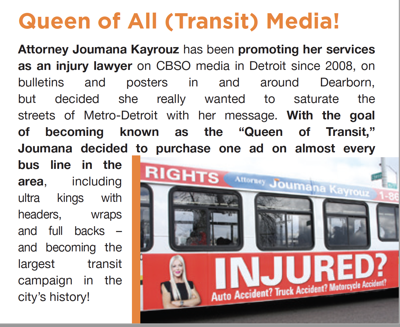 If you are native to Detroit, you know Joumana. In 2012, I was tasked with designing, coordinating and scheduling her ‘all transit’ campaign, which involved having ads on almost every bus in metro Detroit. For a time, you could not leave your house and travel 10 minutes without seeing the ads. Many a meme and post were said about this memorable campaign.